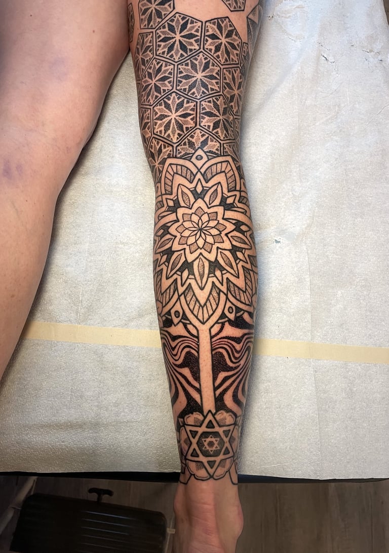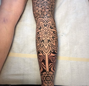 Custom tattoos blending surrealism, geometry, and personal storytelling.